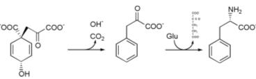 Prephenate is decarboxylated with loss of the hydroxyl group to give phenylpyruvate. This species is transaminated using glutamate as the nitrogen source to give phenylalanine and α-ketoglutarate.
