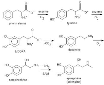 L-phenylalanine can also be converted into L-tyrosine, another one of the DNA-encoded amino acids. L-tyrosine in turn is converted into L-DOPA, which is further converted into dopamine, norepinephrine (noradrenaline), and epinephrine (adrenaline) (the latter three are known as the catecholamines).
