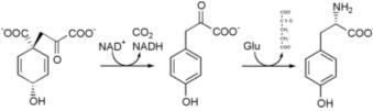 Prephenate is oxidatively decarboxylated with retention of the hydroxyl group to give p-hydroxyphenylpyruvate. This is transaminated using glutamate as the nitrogen source to give tyrosine and α-ketoglutarate.