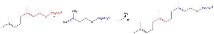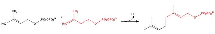 • Dimethylallyl pyrophosphate reacts with 3-isopentenyl pyrophosphate to form geranyl pyrophosphate: