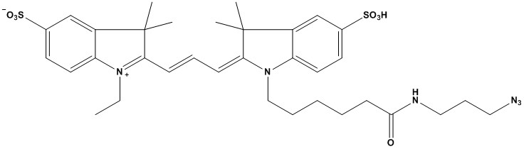 Cyanine 3-N3 Product Catalog # Size Price (USD) Quantity Cyanine 3-N3240304-100MG100 mg$1,400.00 - Cyanine 3-N3-100MG quantity + Cyanine 3-N3240304-500MG500 mg$3,200.00 - Cyanine 3-N3-500MG quantity + Cyanine 3-N3240304-1G1 g$4,500.00 - Cyanine 3-N3-1G quantity + Add to cart Description Synonyms: Equivalent of Cy3-N3 Molecular Formula: C34H44N6O7S2 Molecular Weight: 712.9