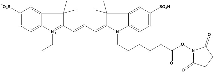 Cyanine 3, SE Product Catalog # Size Price (USD) Quantity Cyanine 3, SE240302-100MG100 mg$1,200.00 - Cyanine 3, SE-100MG quantity + Cyanine 3, SE240302-500MG500 mg$2,800.00 - Cyanine 3, SE-500MG quantity + Cyanine 3, SE240302-1G1 g$3,800.00 - Cyanine 3, SE-1G quantity + Add to cart Description Synonyms: Equivalent of Cy3 NHS Ester CAS #: 146368-16-3 Molecular Formula: C35H41N3O10S2 Molecular Weight: 727.8