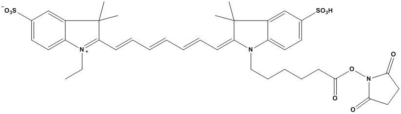 Cyanine 7, SE Product Catalog # Size Price (USD) Quantity Cyanine 7, SE240310-100MG100 mg$1,000.00 - Cyanine 7, SE-100MG quantity + Cyanine 7, SE240310-500MG500 mg$2,500.00 - Cyanine 7, SE-500MG quantity + Cyanine 7, SE240310-1G1 g$3,500.00 - Cyanine 7, SE-1G quantity + Add to cart Description Synonyms: Equivalent of Cy7 NHS Ester CAS #: 477908-53-5 Molecular Formula: C39H45N3O10S2 Molecular Weight: 779.9