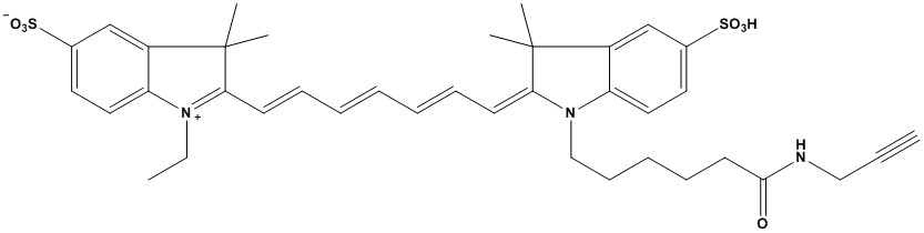 Cyanine 7-YNE Product Catalog # Size Price (USD) Quantity Cyanine 7-YNE240311-100MG100 mg$1,200.00 - Cyanine 7-YNE-100MG quantity + Cyanine 7-YNE240311-500MG500 mg$2,800.00 - Cyanine 7-YNE-500MG quantity + Cyanine 7-YNE240311-1G1 g$3,800.00 - Cyanine 7-YNE-1G quantity + Add to cart Description Synonyms: Equivalent of Cy7-YNE Molecular Formula: C38H45N3O7S2 Molecular Weight: 719.9