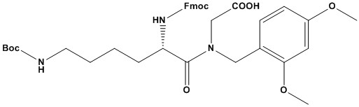 Fmoc-Lys(Boc)-(Dmb)Gly-OH Product Catalog # Size Price (USD) Quantity Fmoc-Lys(Boc)-(Dmb)Gly-OH181055-1G1 g$400.00 - Fmoc-Lys(Boc)-(Dmb)Gly-OH-1g quantity + Fmoc-Lys(Boc)-(Dmb)Gly-OH181055-5G5 g$1,200.00 - Fmoc-Lys(Boc)-(Dmb)Gly-OH-5g quantity + Add to cart Description Synonym: Fmoc-Lys(Boc)-N-(2,4-dimethoxybenzyl)-Gly-OH Molecular Formula: C37H45N3O9 Molecular Weight: 675.8