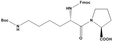 Fmoc-Lys(Boc)-Pro-OH Product Catalog # Size Price (USD) Quantity Fmoc-Lys(Boc)-Pro-OH181153-5G5 g$650.00 - Fmoc-Lys(Boc)-Pro-OH-5g quantity + Fmoc-Lys(Boc)-Pro-OH181153-25G25 g$1,950.00 - Fmoc-Lys(Boc)-Pro-OH-25g quantity + Fmoc-Lys(Boc)-Pro-OH181153-100G100 g$5,500.00 - Fmoc-Lys(Boc)-Pro-OH-100g quantity + Add to cart Description CAS #: 130445-10-2 Molecular Formula: C31H39N3O7 Molecular Weight: 565.7