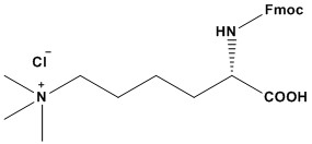 Fmoc-Lys(Me)3-OH chloride Product Catalog # Size Price (USD) Quantity Fmoc-Lys(Me)3-OH chloride101219-1G1 g$450.00 - Fmoc-Lys(Me)3-OH chloride-1g quantity + Fmoc-Lys(Me)3-OH chloride101219-5G5 g$1,500.00 - Fmoc-Lys(Me)3-OH chloride-5g quantity + Add to cart Description Synonym: Fmoc-N-ε-(trimethyl)-L-lysine chloride) CAS #: 201004-29-7 Molecular Formula: C24H31CIN2O4 Molecular Weight: 446.9