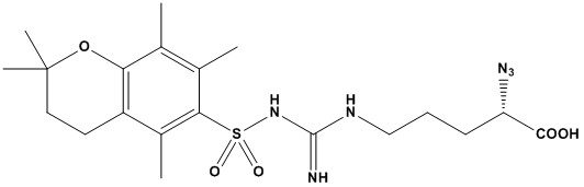 N3-Arg(Pmc)-OH Product Catalog # Size Price (USD) Quantity N3-Arg(Pmc)-OH180142-1G1 g$382.00 - N3-Arg(Pmc)-OH-1g quantity + N3-Arg(Pmc)-OH180142-5G5 g$1,100.00 - N3-Arg(Pmc)-OH-5g quantity + Add to cart Description Synonym: Nδ-Pmc-L-azidoarginine Molecular Formula: C20H30N6O5S Molecular Weight: 466.6