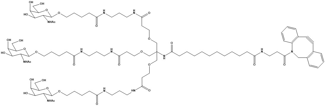 tri-GalNAc DBCO Product Catalog # Size Price (USD) Quantity tri-GalNAc DBCO250704-100MG100 mgPlease InquirePlease Inquiretri-GalNAc DBCO250704-500MG500 mgPlease InquirePlease Inquiretri-GalNAc DBCO250704-1G1 gPlease InquirePlease Inquire Description Molecular Formula: C91H144N12O30 Molecular Weight: 1886.2
